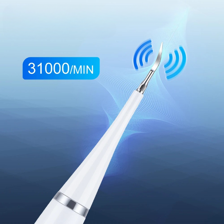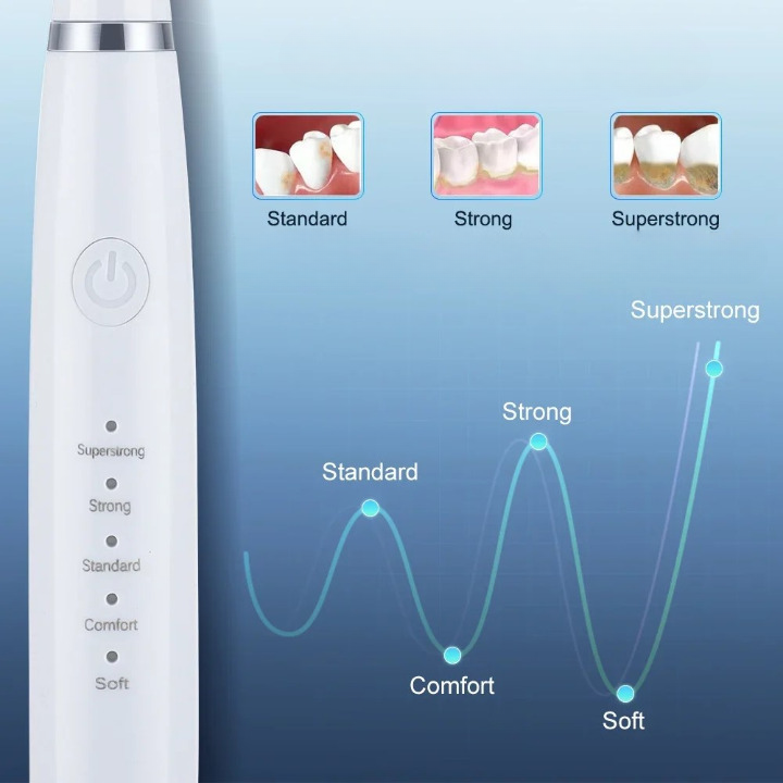 De frequentie kan in 4 niveaus worden aangepast om hardnekkige tandsteen, tandsteen en tandvlekken te verwijderen. Automatische stroomuitval na volledig opladen, automatische bescherming en energiebesparing.