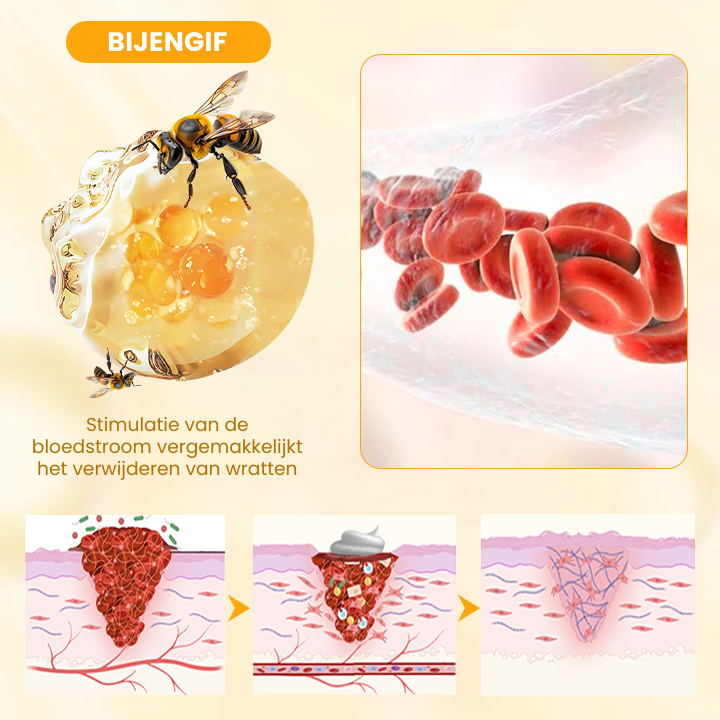 Bijengif is een krachtige natuurlijke huidherstellende behandeling dankzij de unieke bestanddelen. Melittine, een peptide die voorkomt in bijengif, stimuleert de collageenproductie, waardoor de huidelasticiteit verbetert en rimpels verminderen. Fosfolipase A2 is een krachtige ontstekingsremmer die roodheid en irritatie veroorzaakt door acne, eczeem en rosacea verzacht. Bijengif verbetert de bloedcirculatie, waardoor er meer zuurstof en voedingsstoffen naar de huid stromen, de huid sneller geneest en gaat stralen. Het ondersteunt ook de celregeneratie om littekens, striae en acnevlekken te helpen herstellen. Bovendien beschermen de antioxidanten in bijengif de huid tegen schadelijke invloeden van buitenaf en bevorderen ze de gezondheid en vitaliteit op lange termijn.