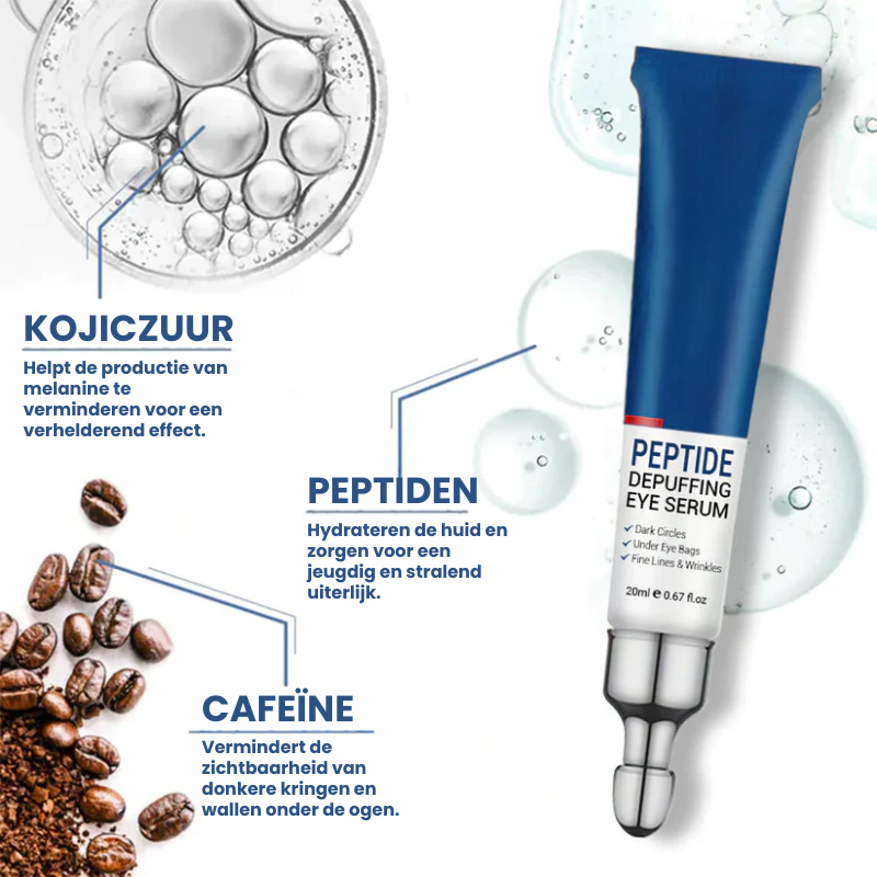 Dit oogserum helpt de huid te liften en rimpels en mimische lijntjes te verzachten. Het bevat kojinezuur en cafeïne, die bekendstaan om het verminderen van donkere kringen en wallen. De huid ziet er beter gehydrateerd, elastischer en frisser uit.