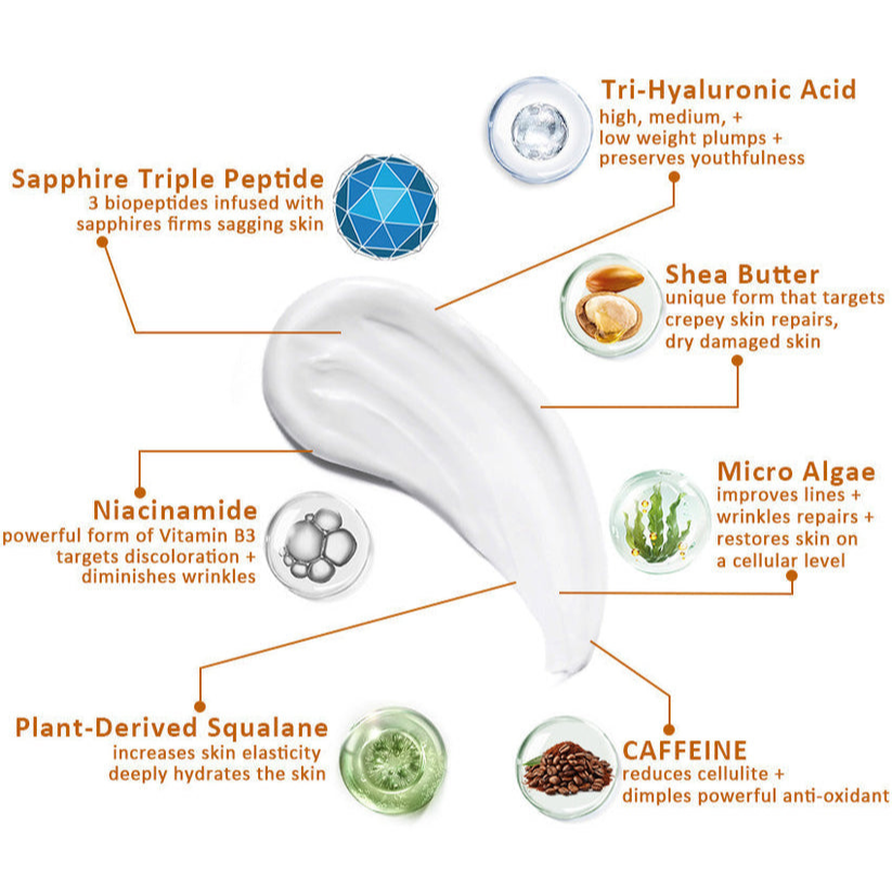 - Triple Peptide met Saffier: Dit complex, dat bekend staat als het toppunt van peptidetechnologie, dringt dieper door in de huidlagen voor snellere resultaten en pakt de problemen van een vale en slappe huid effectief aan.