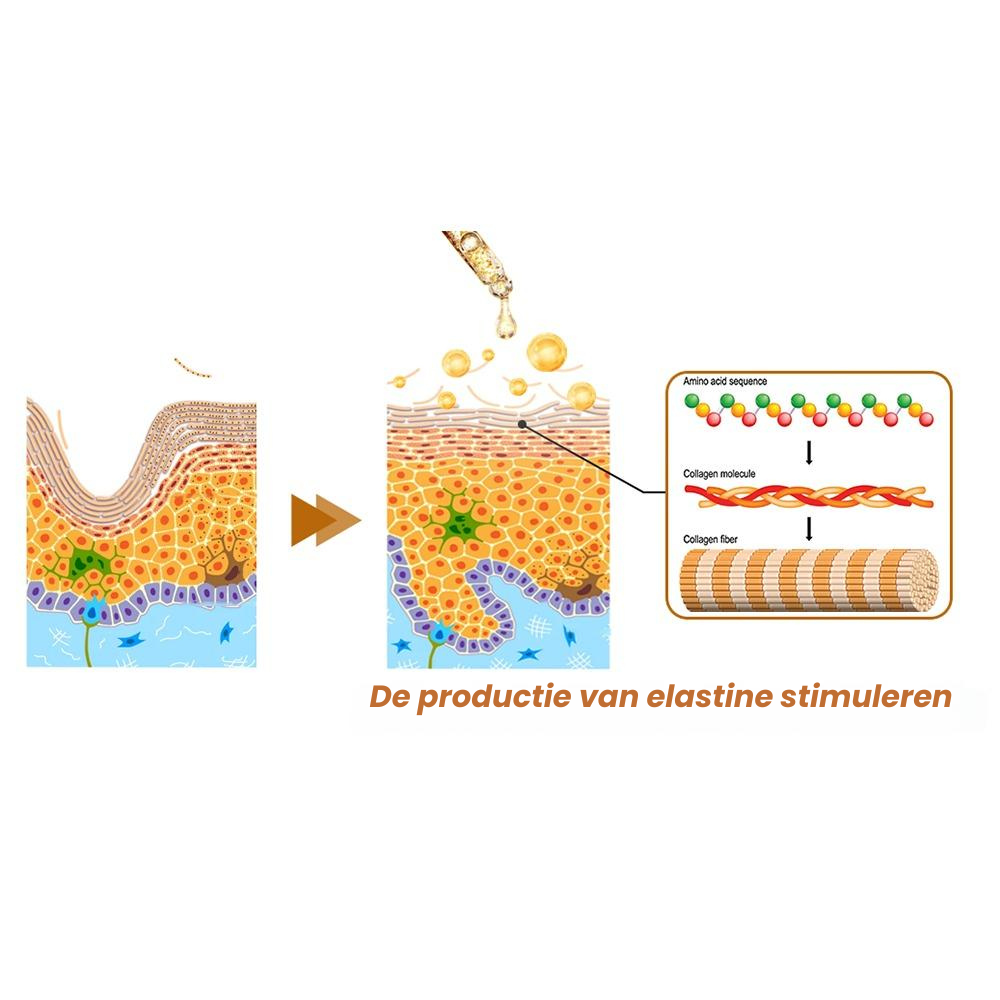 Naast collageen kan palmitoylpeptide ook de productie van elastine stimuleren. Elastine is een ander essentieel eiwit dat ervoor zorgt dat de huid na uitrekking haar oorspronkelijke vorm weer aanneemt. Verhoogde elastineniveaus dragen bij aan een verbeterde elasticiteit van de huid, helpen verslapping tegen te gaan en zorgen voor een jeugdiger uiterlijk.