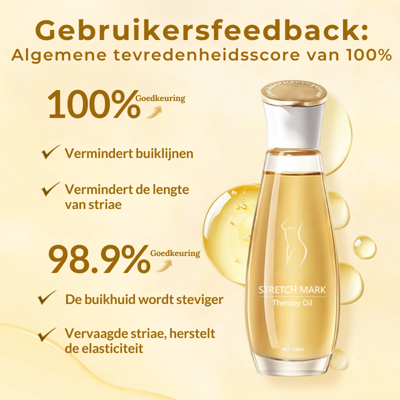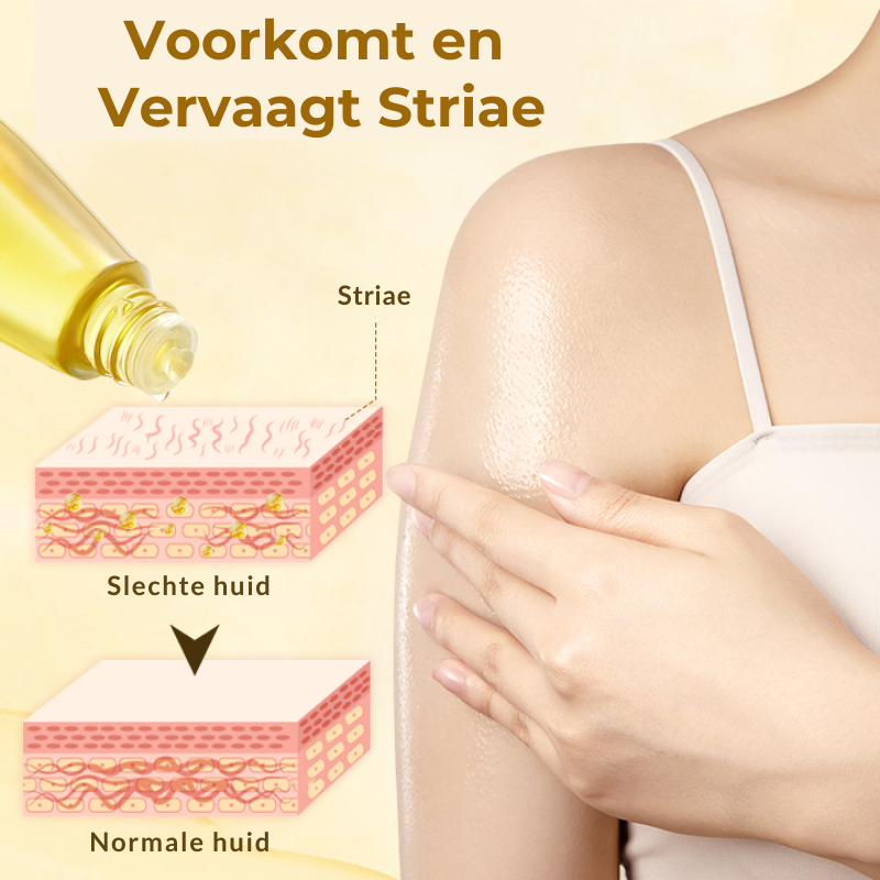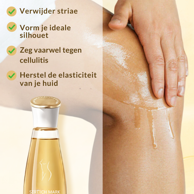 Onze Striae Therapie Olie combineert de effectiviteit van natuurlijke ingrediënten met geavanceerde technologie, gericht op het verbeteren van de lichaamshouding en het aanzienlijk verminderen van de zichtbaarheid van cellulitis en striae.