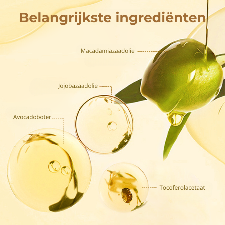 - Macadamia zaadolie: Deze olie fungeert als een beschermende barrière en vult essentiële voedingsstoffen aan. Het verhoogt de elasticiteit en het vochtgehalte van de huid, bevordert herstel en veerkracht. De eigenschappen ondersteunen de plumpheid en verminderen de zichtbaarheid van striae.