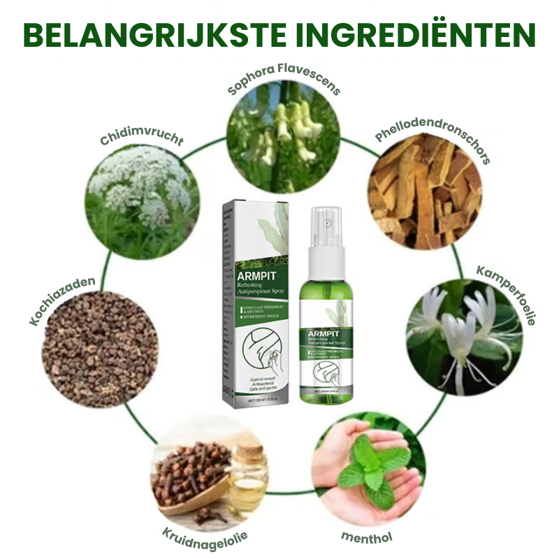 Dankzij de krachtige combinatie van eugenol en kruidenextracten pakt deze spray de oorzaak van lichaamsgeur aan, diep in de huid. Het gebruikt natuurlijke plantenextracten om transpiratie te reguleren, vochtophoping te voorkomen en je huid de hele dag fris en comfortabel te laten aanvoelen.